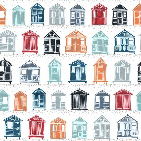 This fabric is 100% cotton and is designed by Makower UK. The range is called ‘Marina’. For information and scale, the beach huts measure approximately 3.5cm in height.